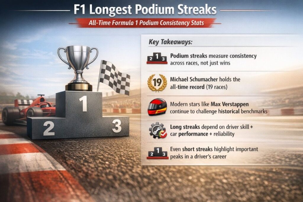 Podium streaks remain one of the clearest indicators of dominance and consistency in Formula One. From the legendary run of Michael Schumacher to the modern dominance of Max Verstappen, these streaks tell the story of Formula 1’s greatest drivers and teams.