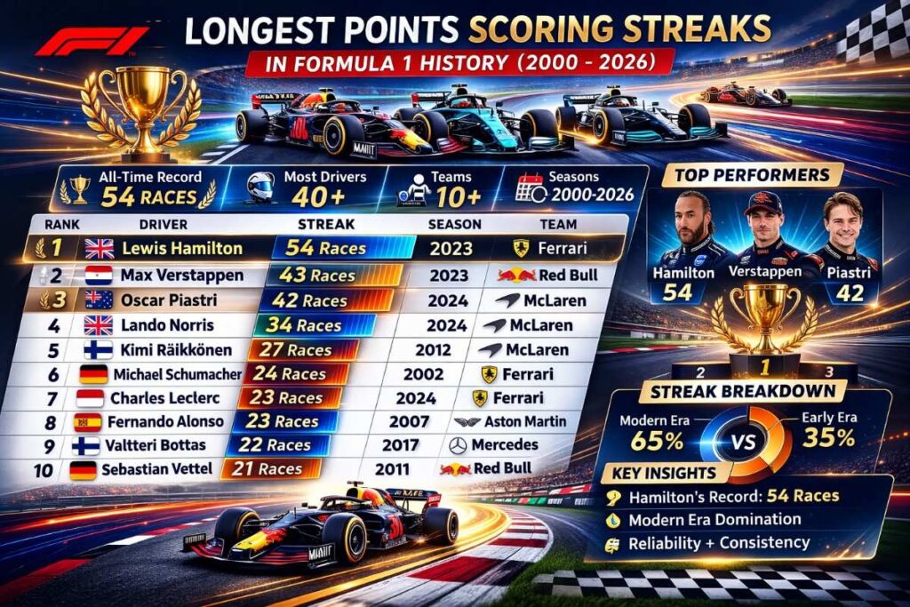 This page provides a complete breakdown of the longest points streaks in F1 history (2000–2026), highlighting the drivers who delivered elite-level consistency across multiple seasons.
