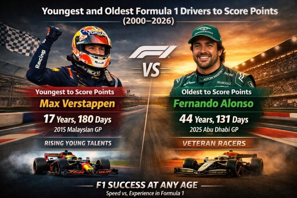 This article looks at the youngest and oldest Formula 1 drivers to score points between 2000 and 2026. Max Verstappen set the record as the youngest points scorer at 17 years and 180 days during the 2015 Malaysian Grand Prix. On the other end, Fernando Alonso became the oldest driver to score points at 44 years and 131 days in the 2025 Abu Dhabi Grand Prix.